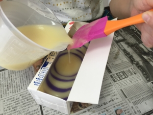 この写真は以前行ったときの写真なので色が付いたタネですが、今回は色のない石けんを作りました。